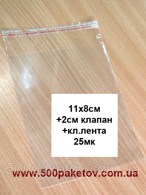 Пакет з клапаном 11х8см + 3клапан +кл.лента. Матеріал – BOPP 25мкм, поліпропілен прозорий блискучий, шелестячий. Багато розмірів в наявності. Зніжки від 500грн -5%. Ваш розмір – наш мінімальний тираж і терміни виготовлення. Під замовлення може бути інший розмір і товщина.